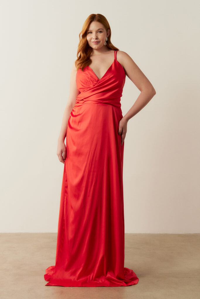 - Para vestidos longos, tecidos estruturados e sofisticados como cetim, seda e tule com caimento criam imponência.