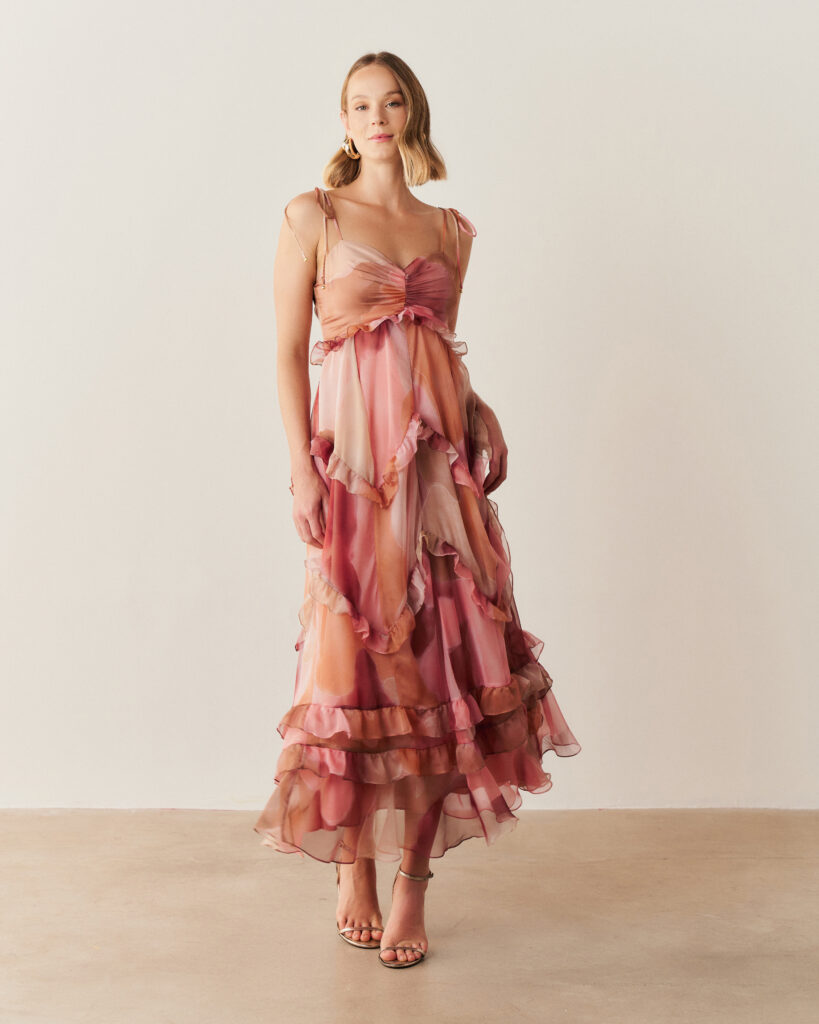 Imagine uma celebração em ambiente aberto, iluminada pela luz natural. Um vestido midi fluido é a escolha perfeita: