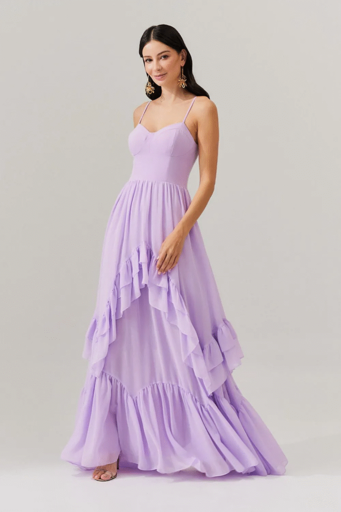 A modelo está usando o Vestido Longo com Decote Coração e Babados Assimétricos – Bélgica