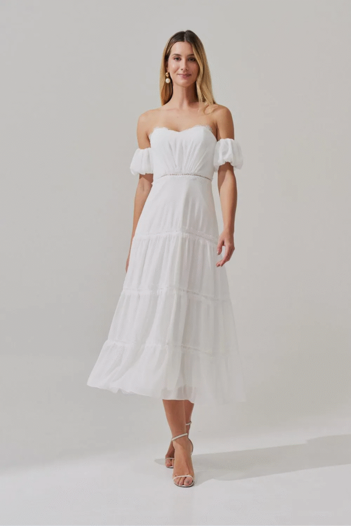 • Branco e Off-White: A escolha mais simbólica e sofisticada. Um vestido branco representa o início de um novo ciclo, a paz e a serenidade. Funciona como uma tela em branco, permitindo que a sua beleza e a sua felicidade sejam o ponto central da celebração. É uma opção atemporal, que transmite uma elegância silenciosa e fotografa lindamente.