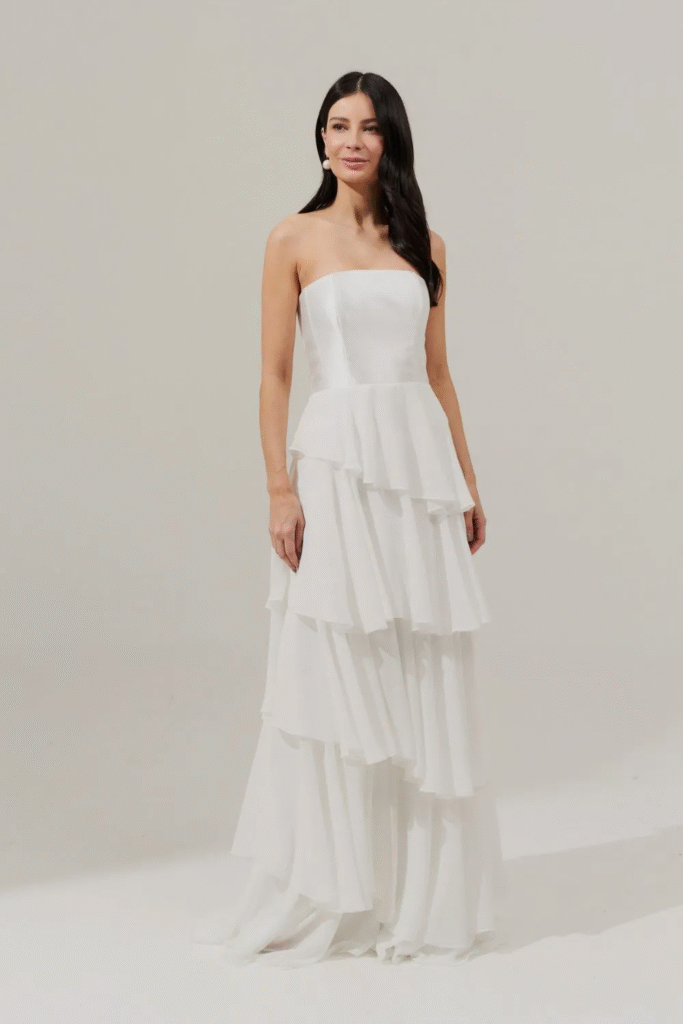 • Fluidez e Movimento: A tendência mais importante é o seu conforto. Vestidos com tecidos fluidos e modelagens que não restringem são essenciais. Peças que permitem que você se mova, receba seus convidados e aproveite cada instante com naturalidade são a definição de um design inteligente.