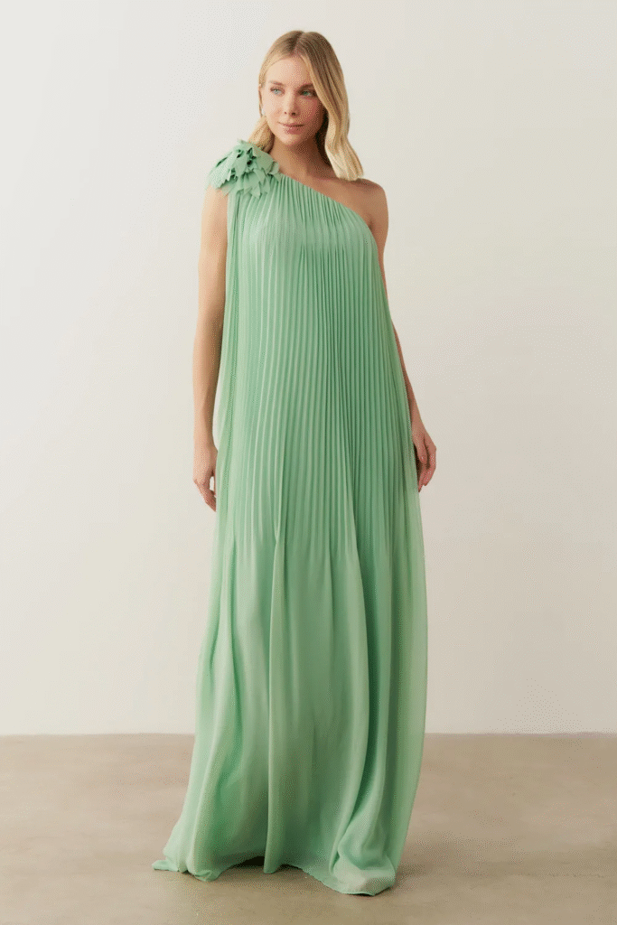 A modelo está usando o Vestido de Festa Longo e Plissado com Decote Ombro Único – Paris