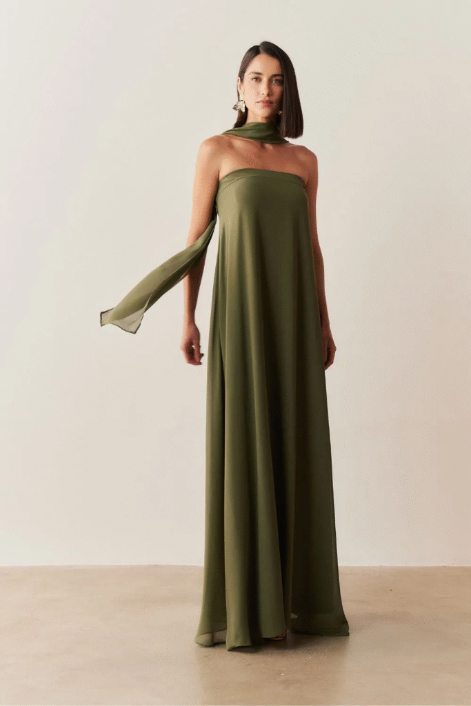 A modelo está usando o Vestido Longo Sem Alça com Echarpe