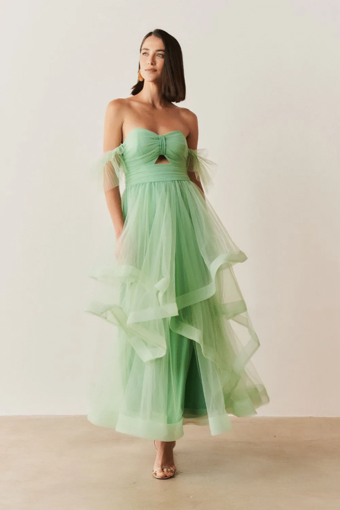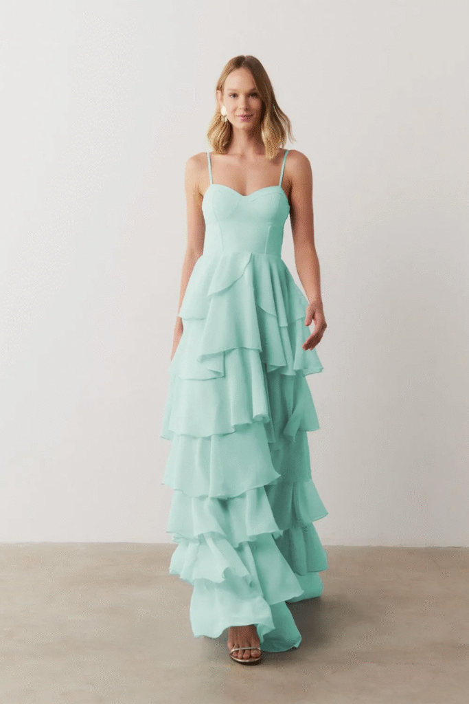 A modelo está usando o Vestido Longo com Decote coração, Alças Finas e Saia em Babados