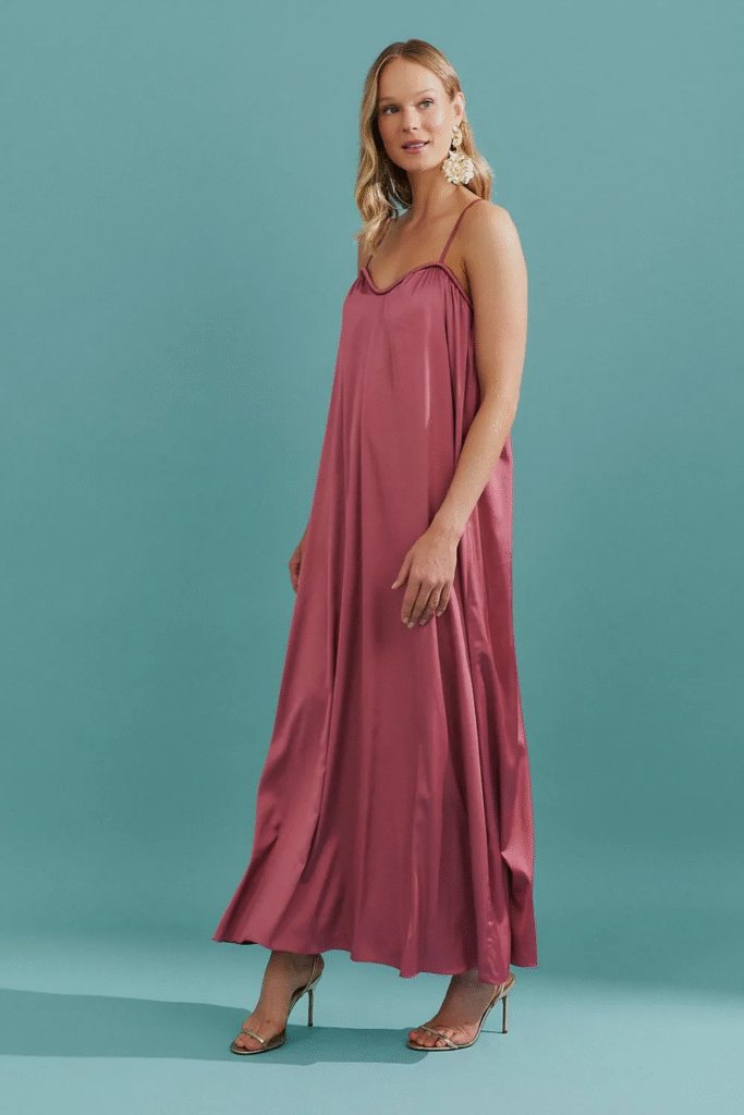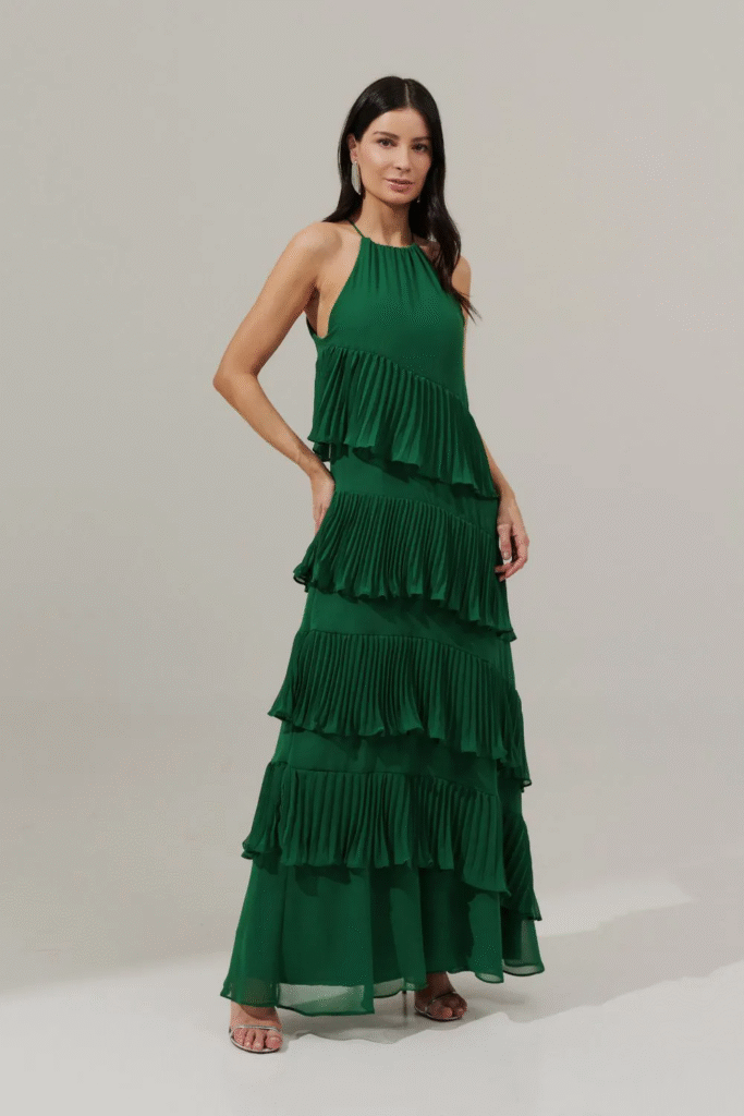 A modelo está usando o Vestido Longo com Decote coração, Alças Finas e Saia em Babados – Indonésia